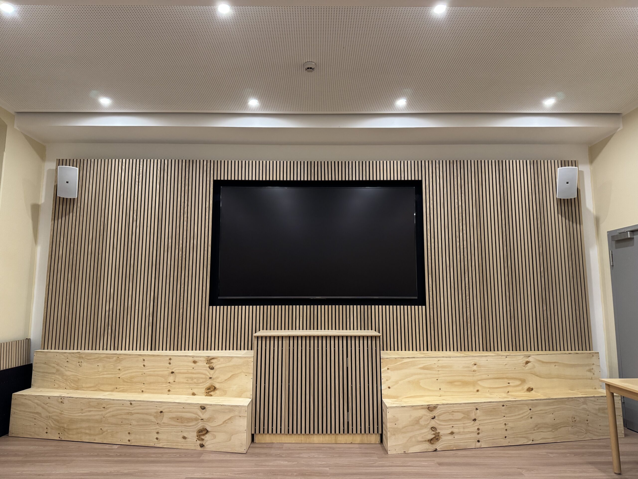 Diese Woche wurden die Akustikwand & Technikschrank fertiggestellt. Es wurden die gesponserten Akustikpaneels an die Wand geklebt, die Bilderleisten montiert